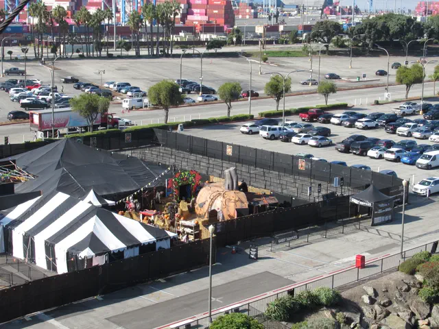 At LAX, we caught the shuttle from the airport to the LA public transportation hub. We bought the transport TAP card (doh, we already had two at home from our 2023 trip) and a trip to Long Beach on the train. No scary fight in our train car like in 2023 thankfully. We had one train change and got off by Von's for cruise necessities, snack that night, and breakfast. The Queen Mary restaurants looked very pricy. We found a close restaurant for a lunch-dinner. We were first going to do Taco Tuesday at Leo's Mexican Grill. But when we arrived they had closed at 3pm, and it was now 3:15pm. So, we walked to the Dog Haus and had some fancy sausages. We missed the restroom here because someone came in the side door while we were eating, went into the only restroom, and did not leave. We caught an Uber to Queen Mary. Queen Mary had their Halloween event setup in front, so she dropped us off outside of that. She had to grab a ticket outside the gate, but it said free for up to 10 minutes inside the gate.