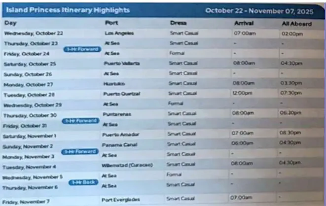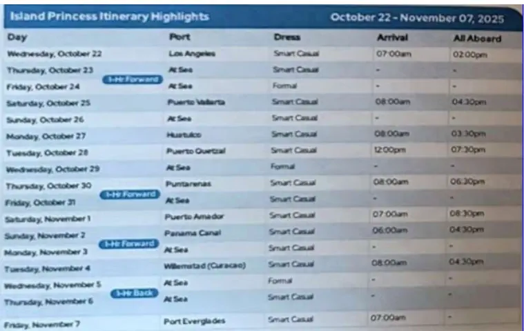The itinerary from the Princess Patter since it changed a couple of times after we booked, for formal night detail, and time change detail. Though they moved the 1-Hr Back at the end to the last night -- get people awake and off the ship quickly.