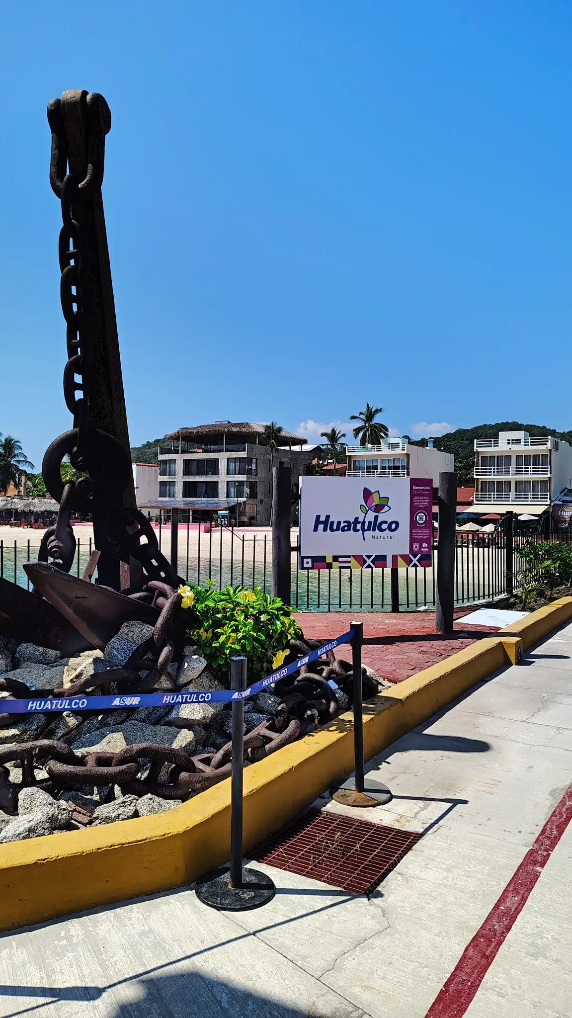 Walking back to port, this was to get a Huatulco sign picture, but it is very far away. This church and ship look good together. Anchor and sign.