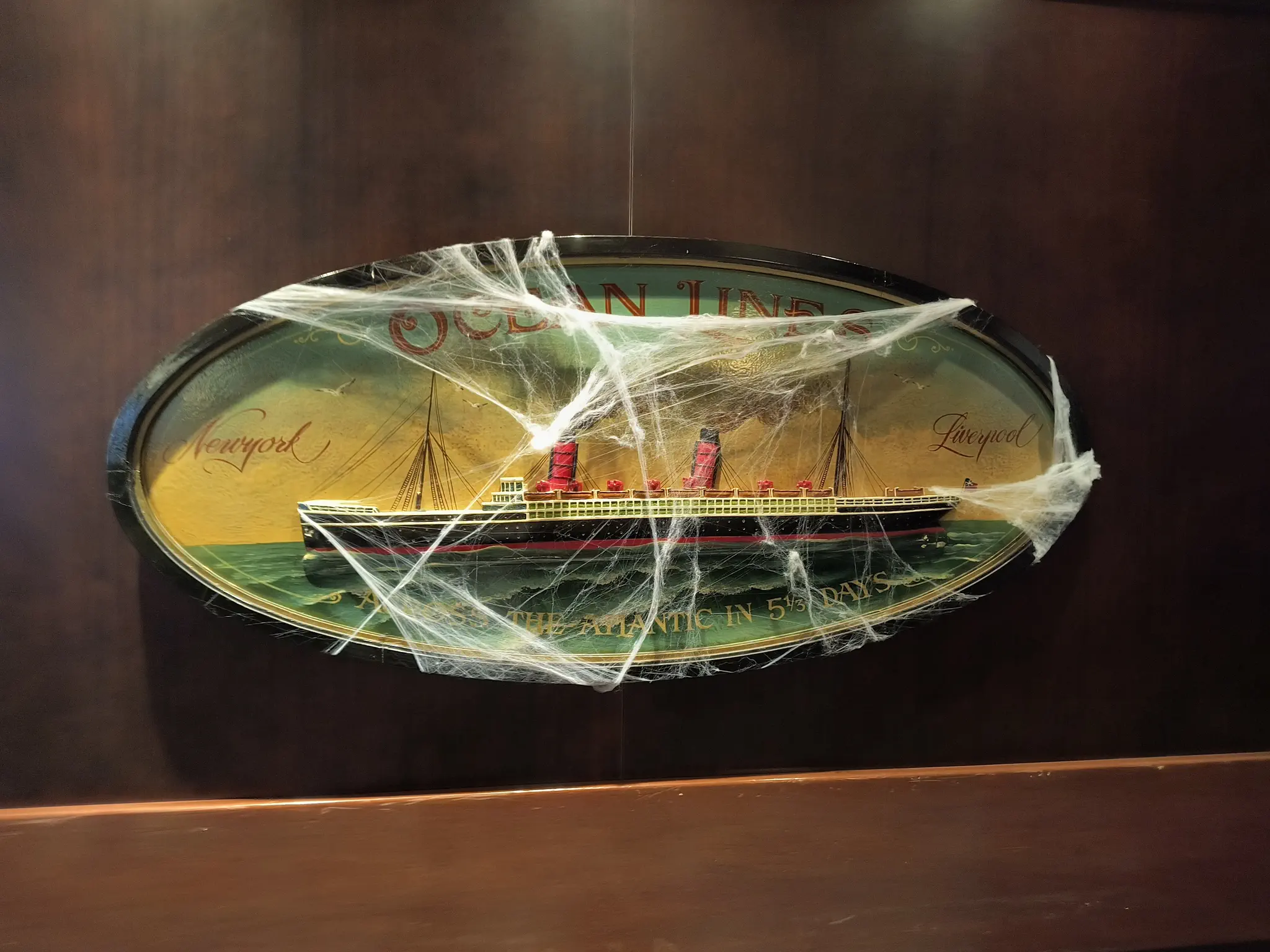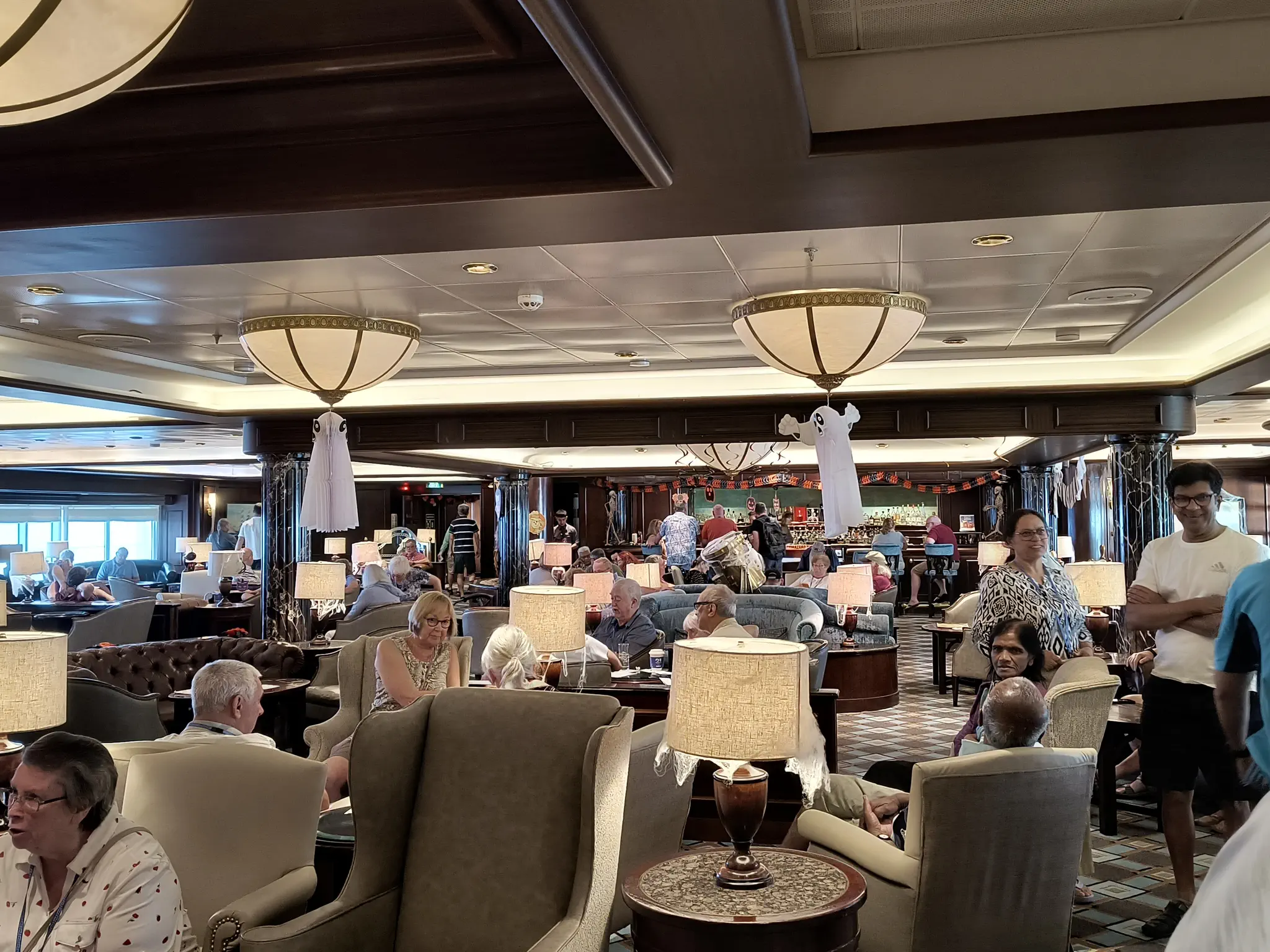 The Halloween decorations are out. We frequently went to trivia in this lounge -- The Wheelhouse Bar.