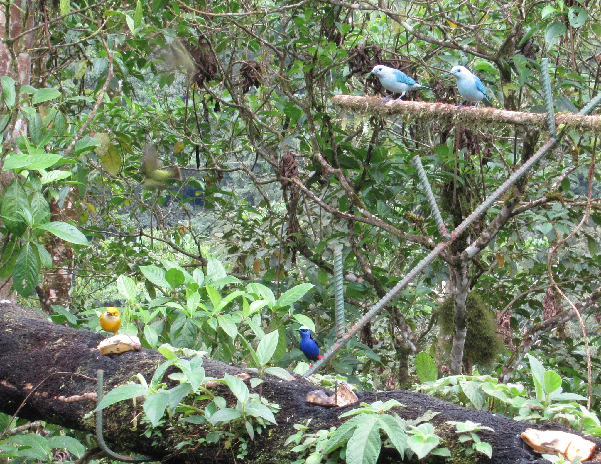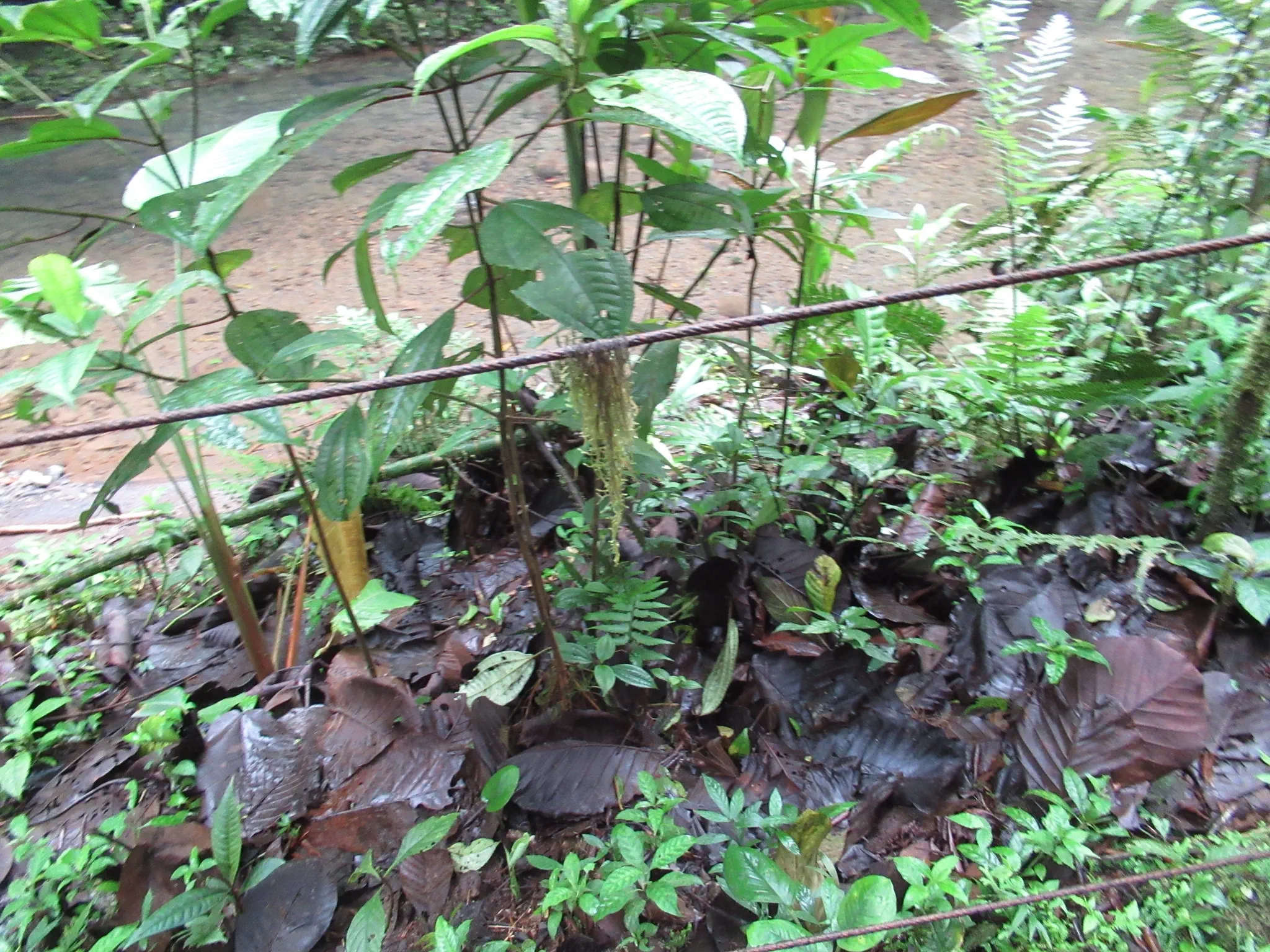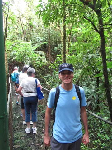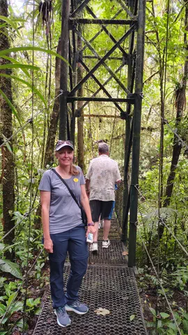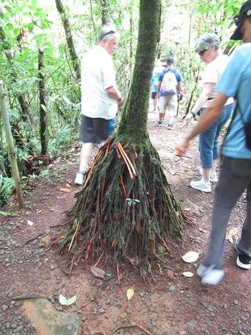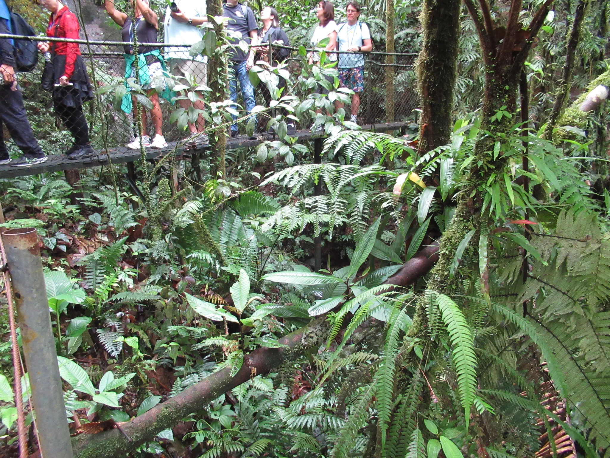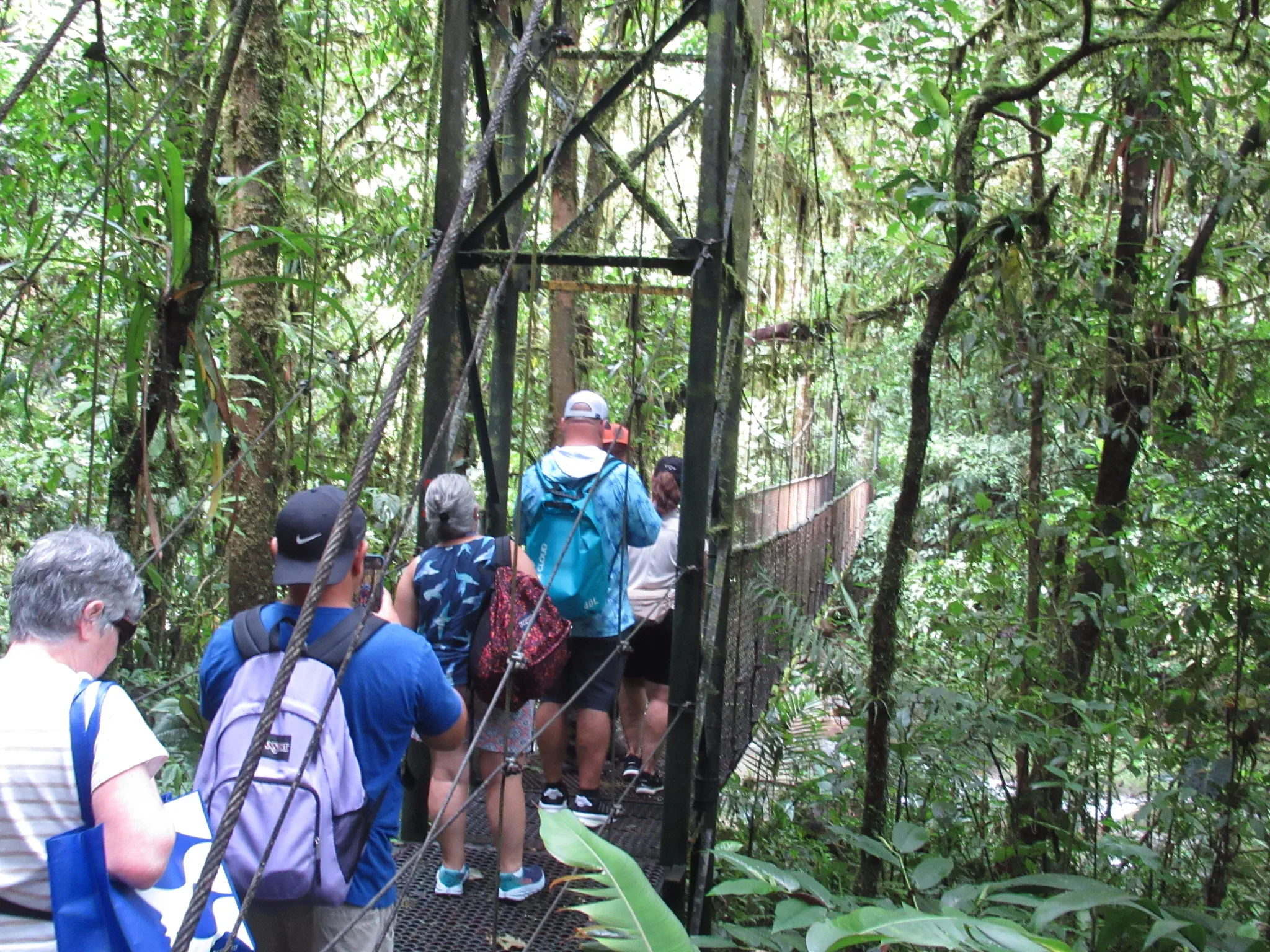 We left for the rainforest hike with the hanging bridges from the buildings with the restaurant, restrooms, gift shop, and food shop. They had an area in back where they put out food to attract birds. I don't have a picture, but we found the Costa Rica national bird. Of all the pretty birds, they picked a brown bird for the national bird. It does have a pretty singing voice though we heard. Our tour guide showed us/told us about local birds and animals from a DK travel book on drive.