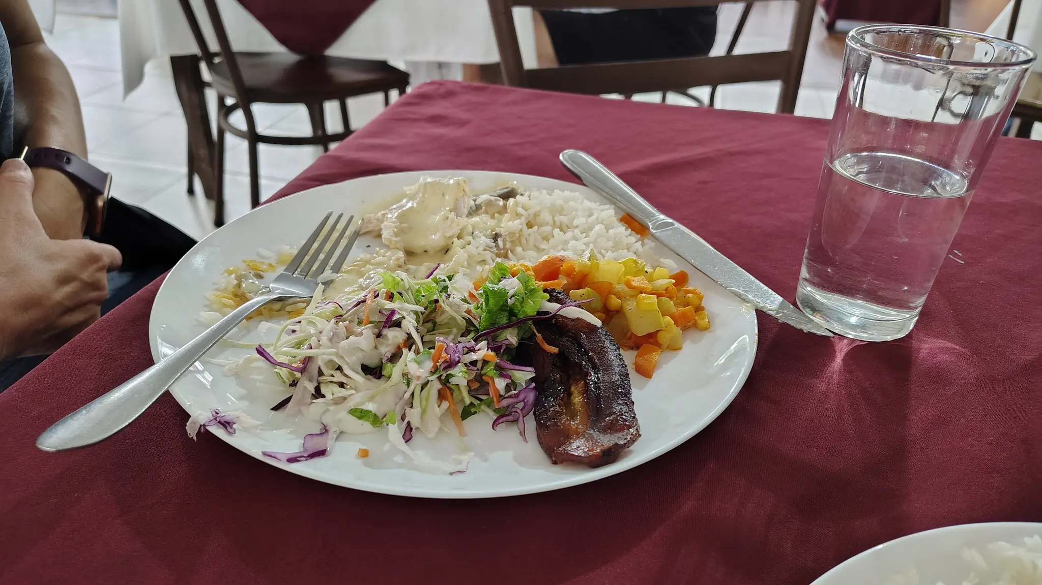 The guide then asked if we wanted to go eat. I was happy watching the birds. I also did not remember our trip coming with a lunch, but it did. I was not close enough not to the beginning of the line to hear the guide explain what all the food on the served buffet was, and I'm a picky eater. When I asked, they gave the dish name, which I did not recognized. I pointed to what I thought was the pork but ended up with chicken. Travis got the pork, and we shared. I was worried that the chicken did not look good, but it was good. His pork was better, but the chicken was still good. It had a cream sauce. My plate in the picture -- cream chicken, rice, vegetables called picadillo, plantain, and a salad.