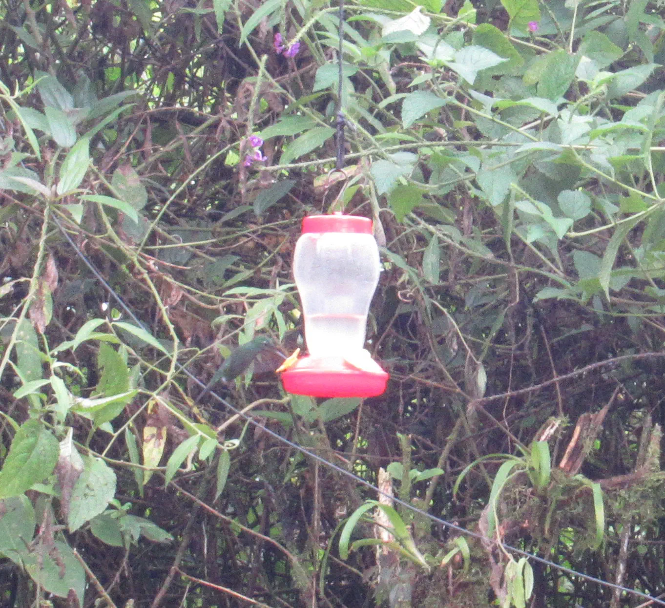 They put out hummingbird feeders. He was fast; this is the best picture that I got -- on the left side of the feeder. An interesting plant.