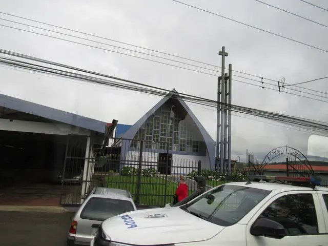 Church and police vehicle. Local houses; I saw several houses and sheds/garages built at an angle since the land was at an angle.