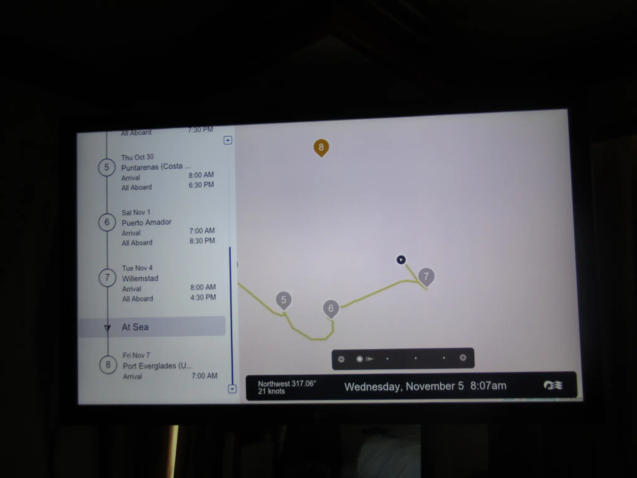 I finally decided that the bed looked so lumpy that I had to take a picture. Also, our trip map stopped showing the underlaid map maybe 5 days before the end of the cruise; they never fixed it.