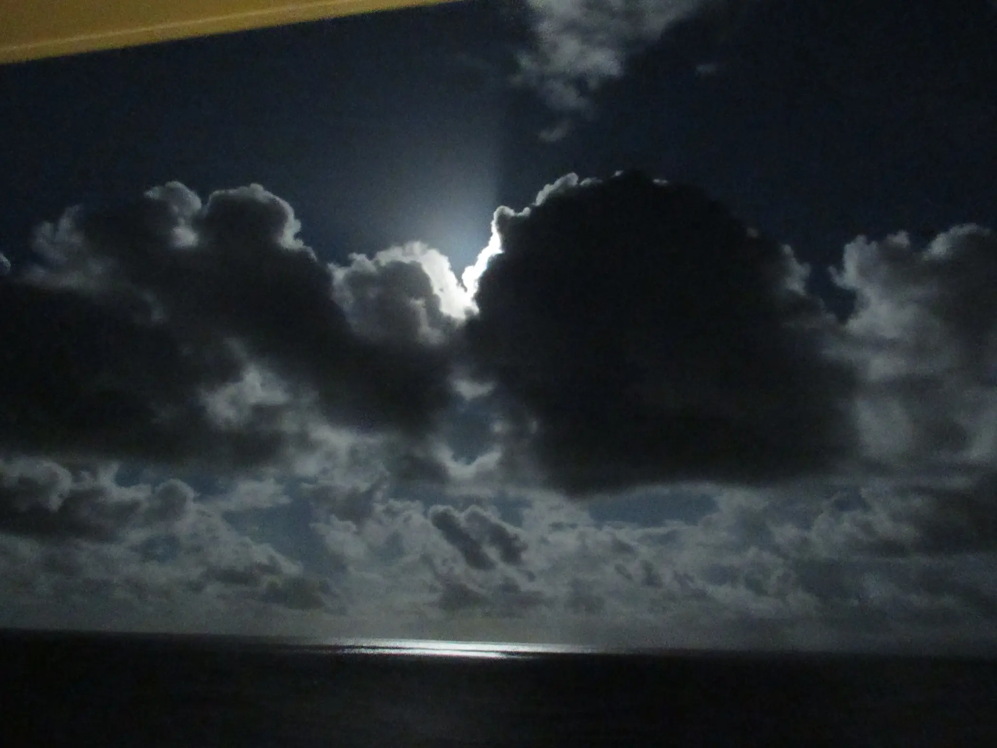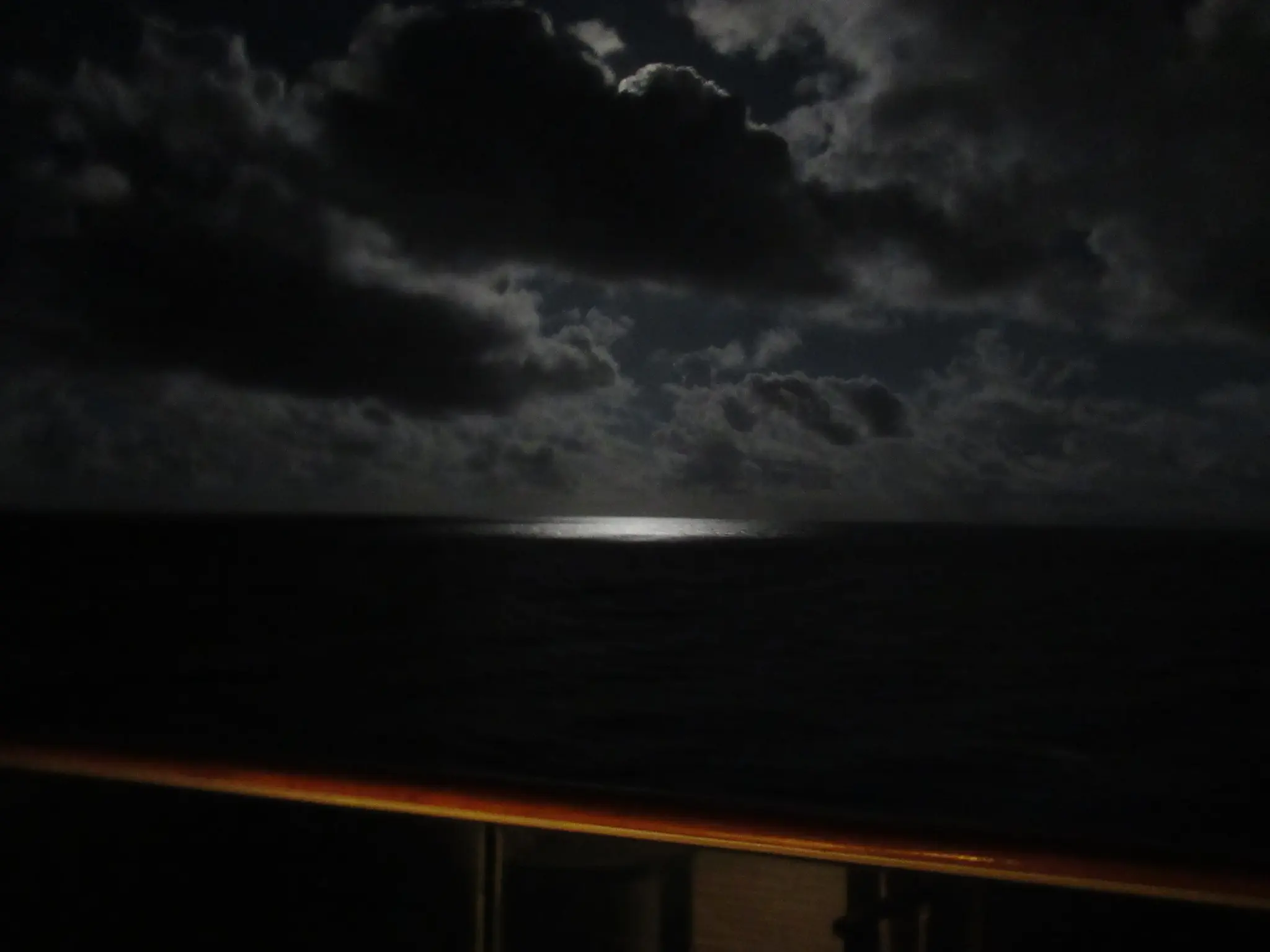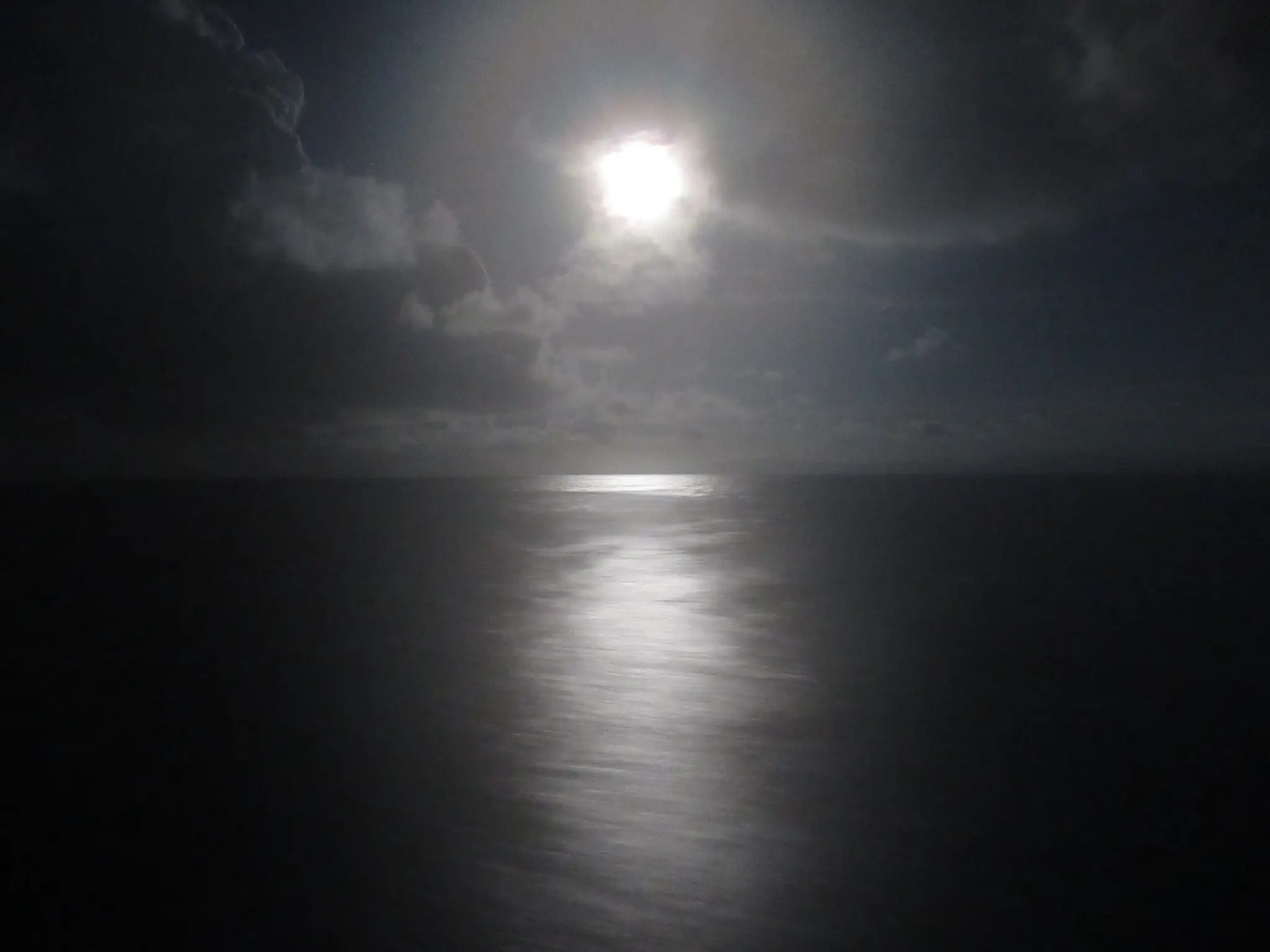 First some moon pictures. We started the trip with a tiny moon sliver and got to a full moon. Only Travis can take moon pictures, so here is my moon picture that looks like an eye. On the ship, the photo shop was selling iris photos; this picture reminded me of that. I love the illumination on the water, especially the partial illuminations due to the moon behind a cloud.