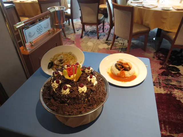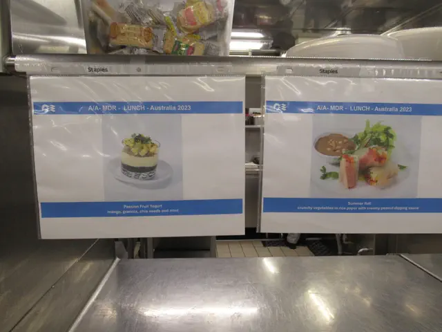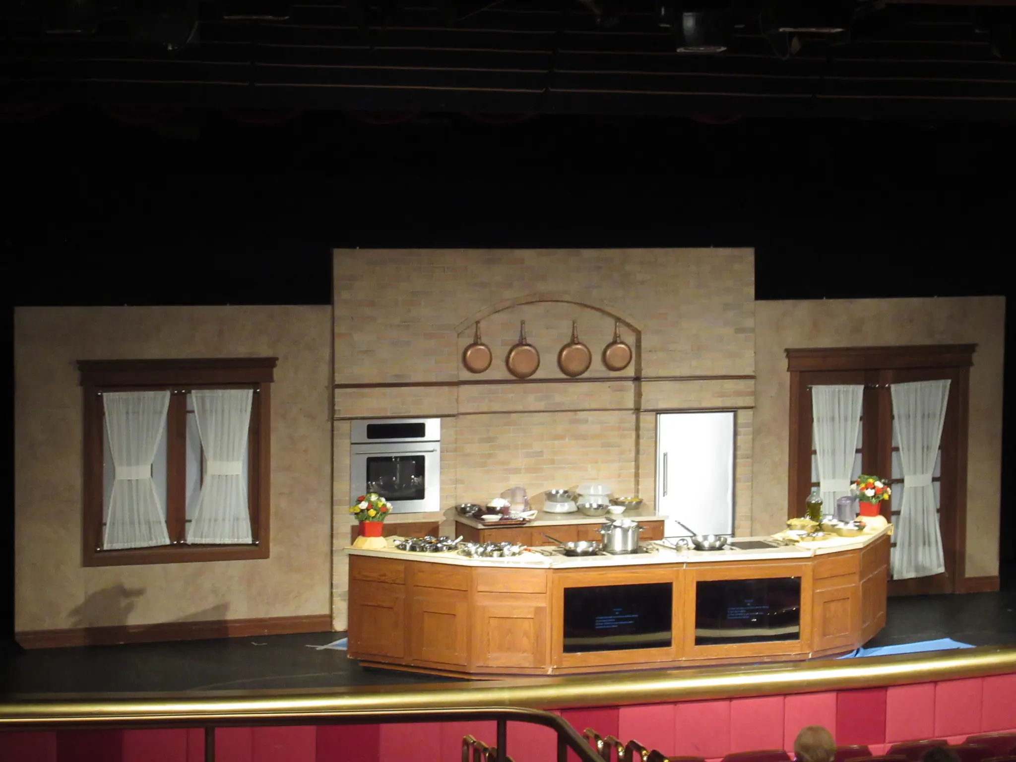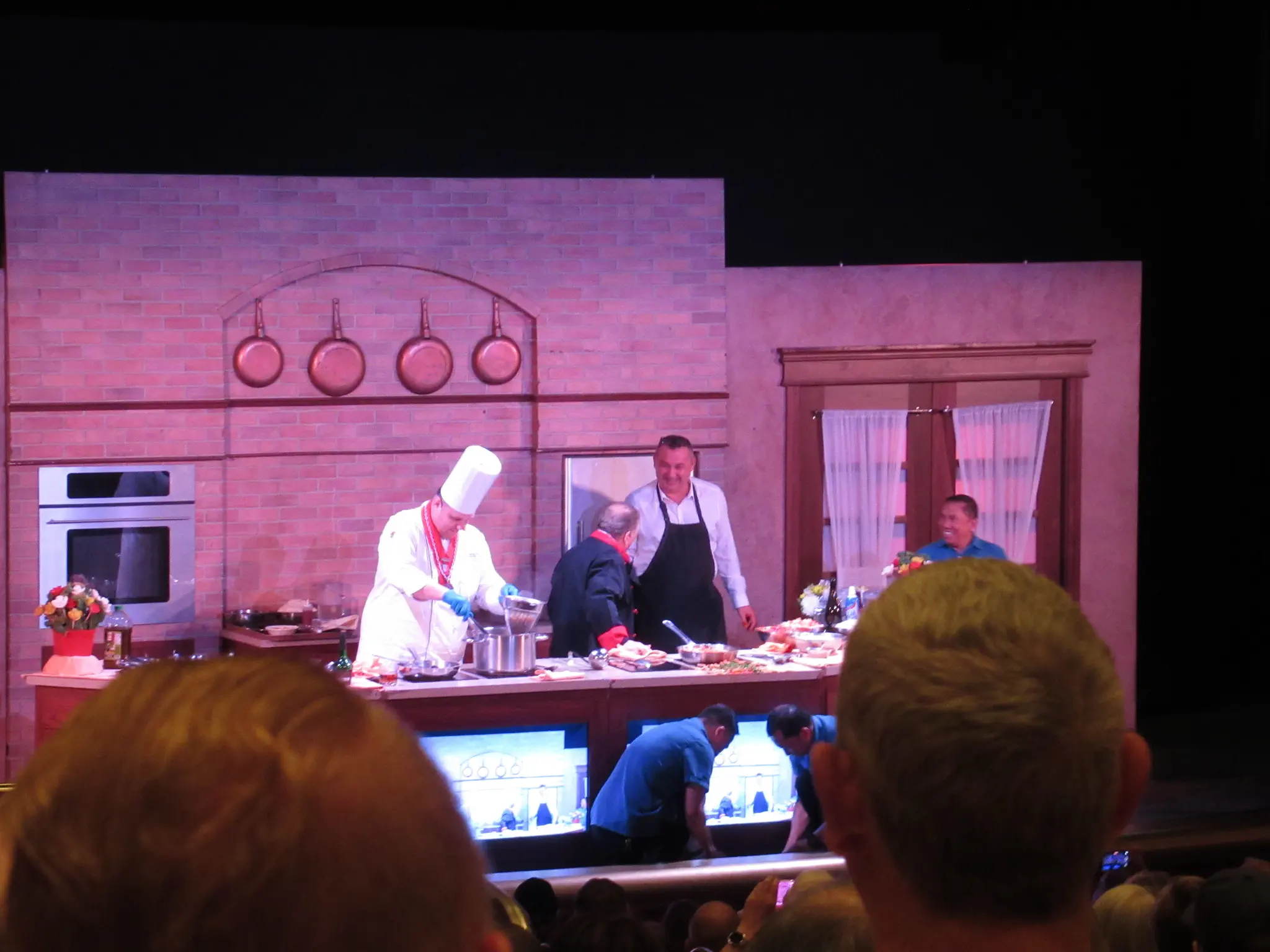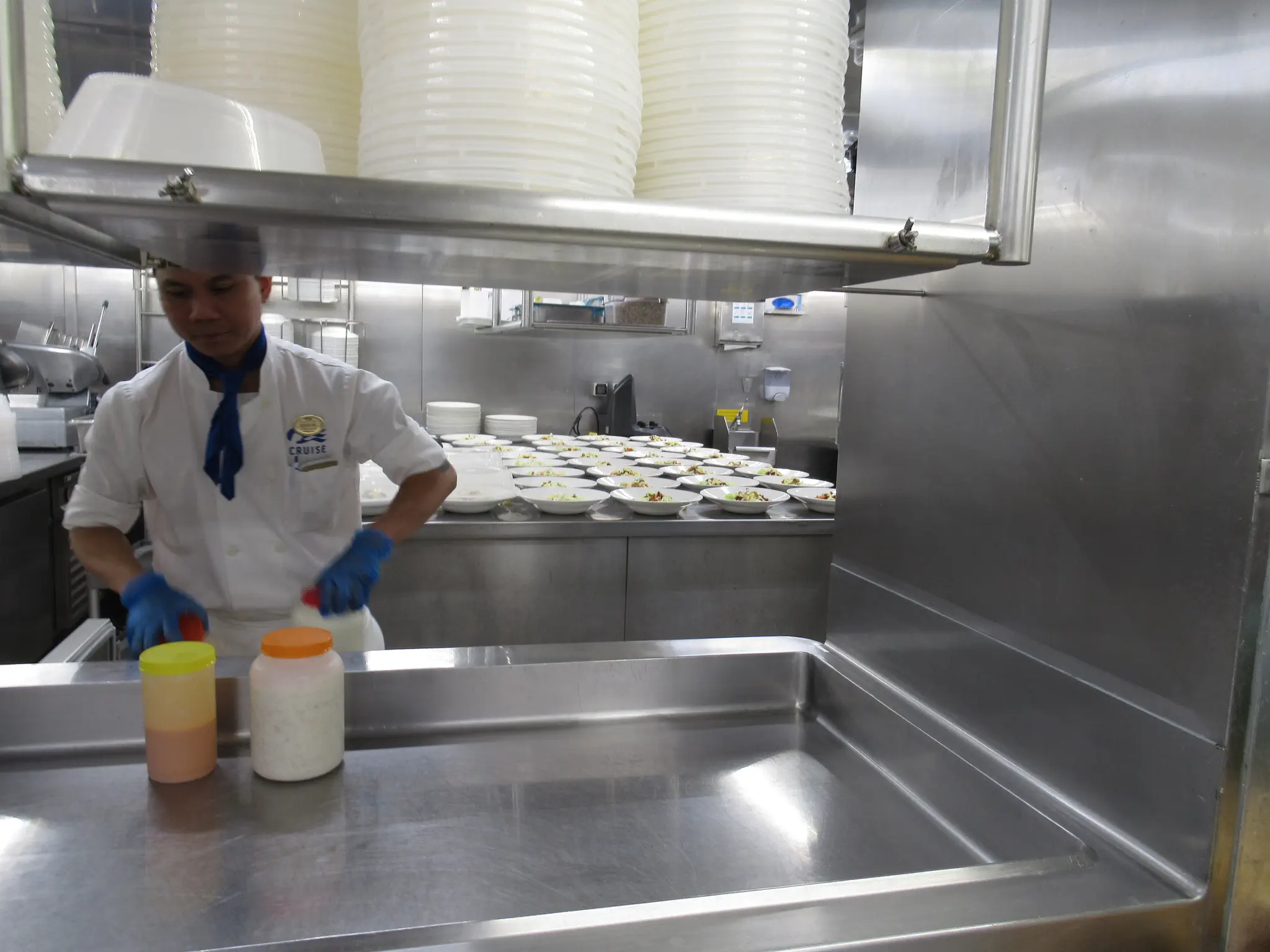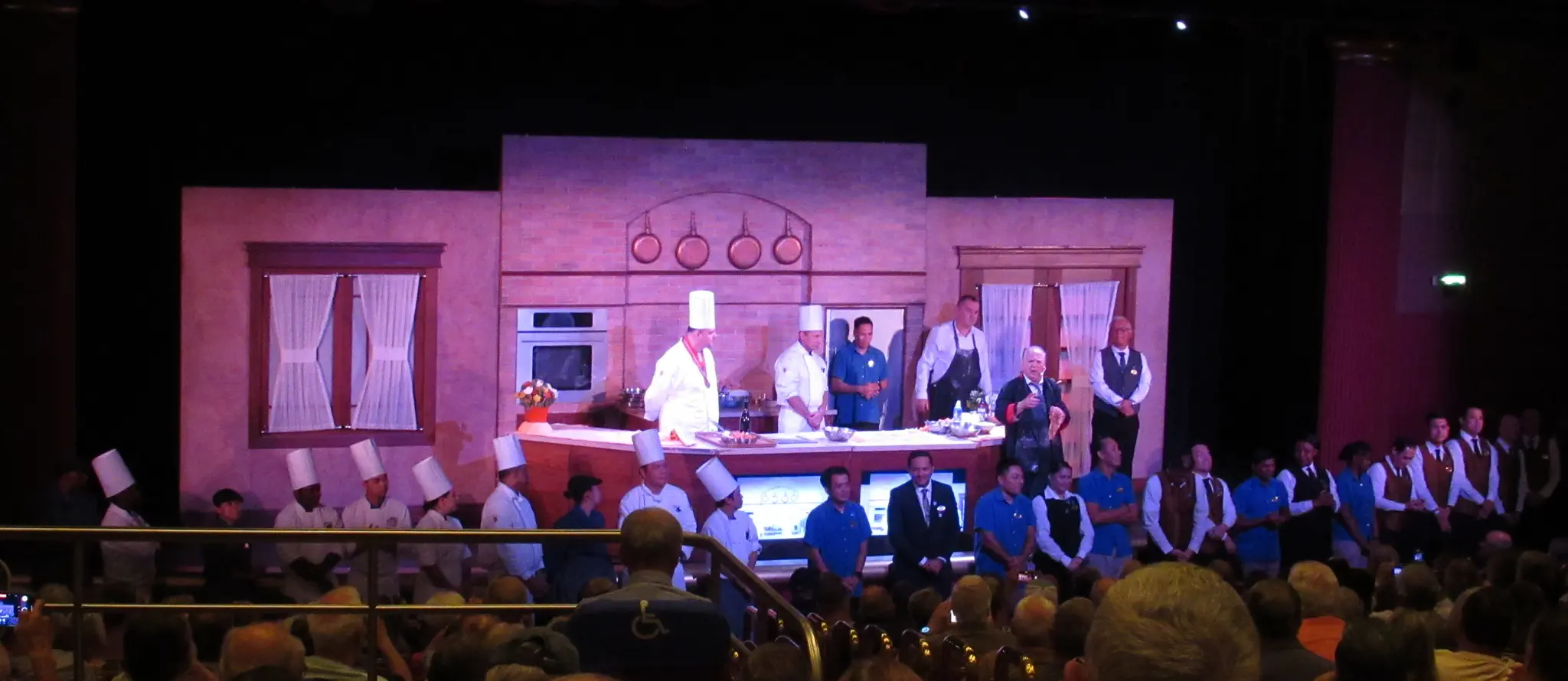 The culinary team held this event -- a cooking challenge between the Executive Chef and the Director of Restaurant Operations. See the handout under Culinary Galley Tour Handout. The Chef prepared things correctly and the Director just threw everything on a plate, so it was funny. At the end of the galley tour both preparations were on display (pictures below). This was in the theater. The TVs at the front was supposed to show a view down of what they were doing, but only showed this for a little bit and showed it head on like we were already seeing for most of the time. After show, we were allowed to meet at the MDR for a walk through tour of the galley. They did not talk about anything during the tour, just a single file line through the galley. It was cool that they let everyone see it.