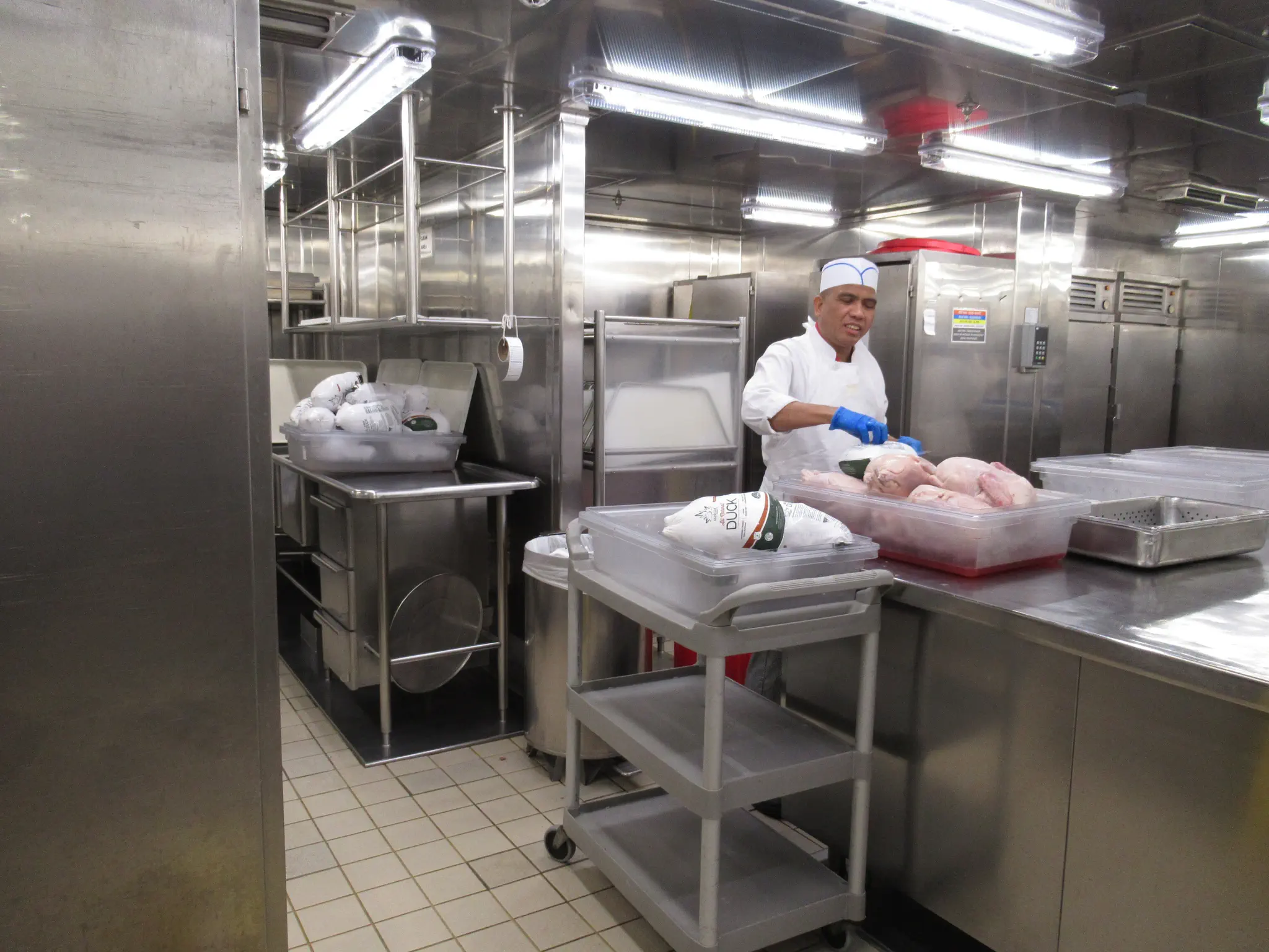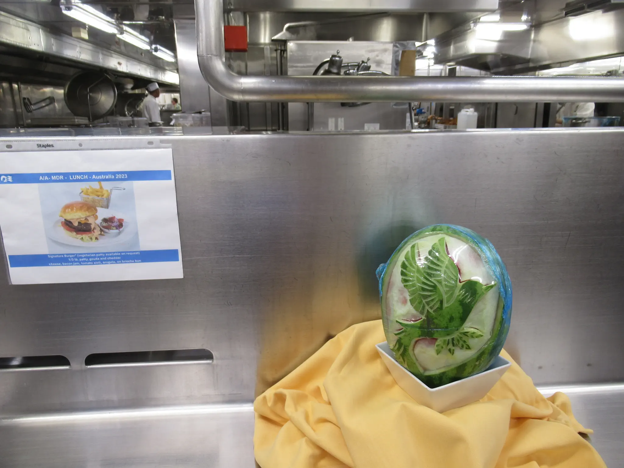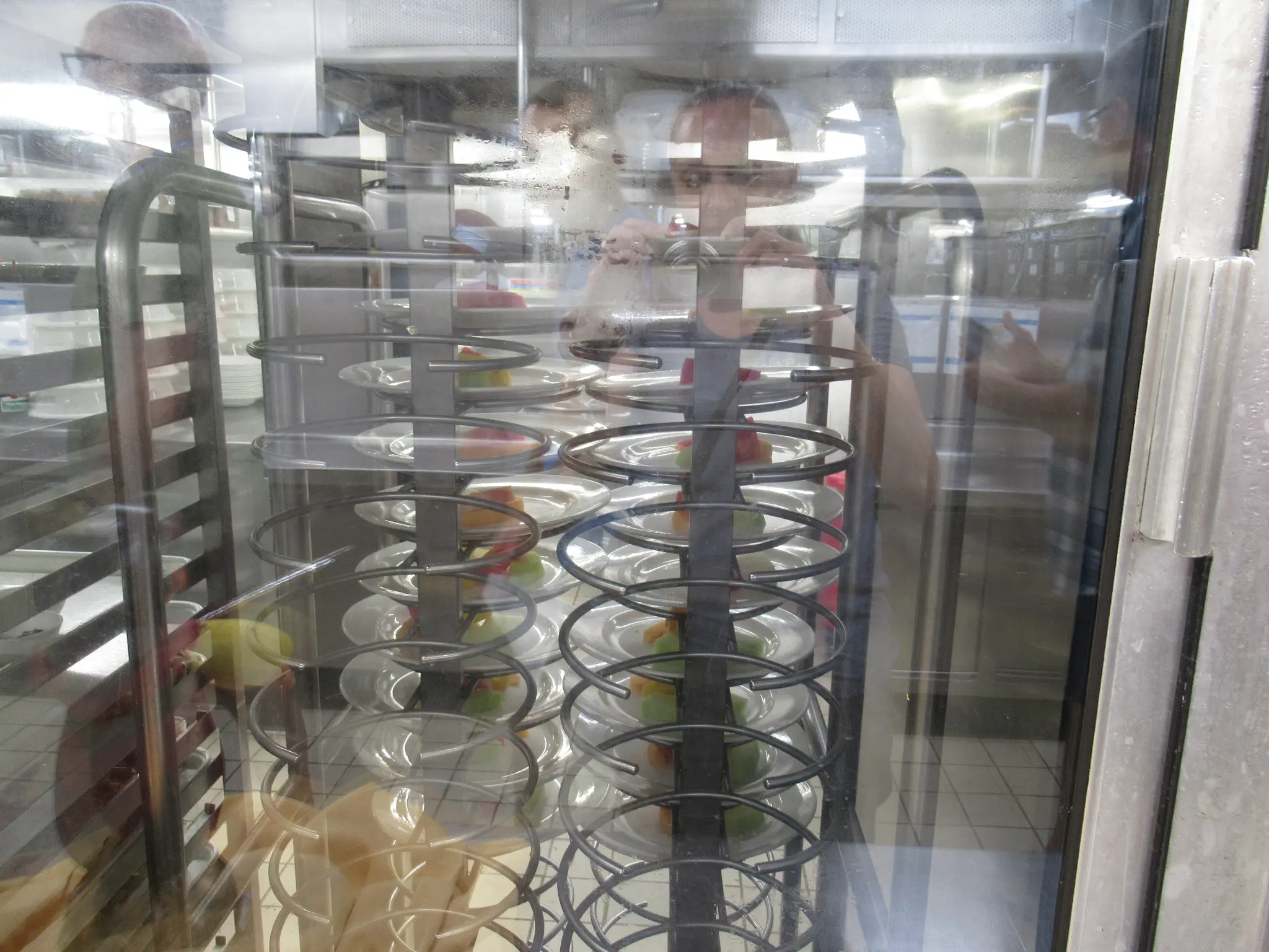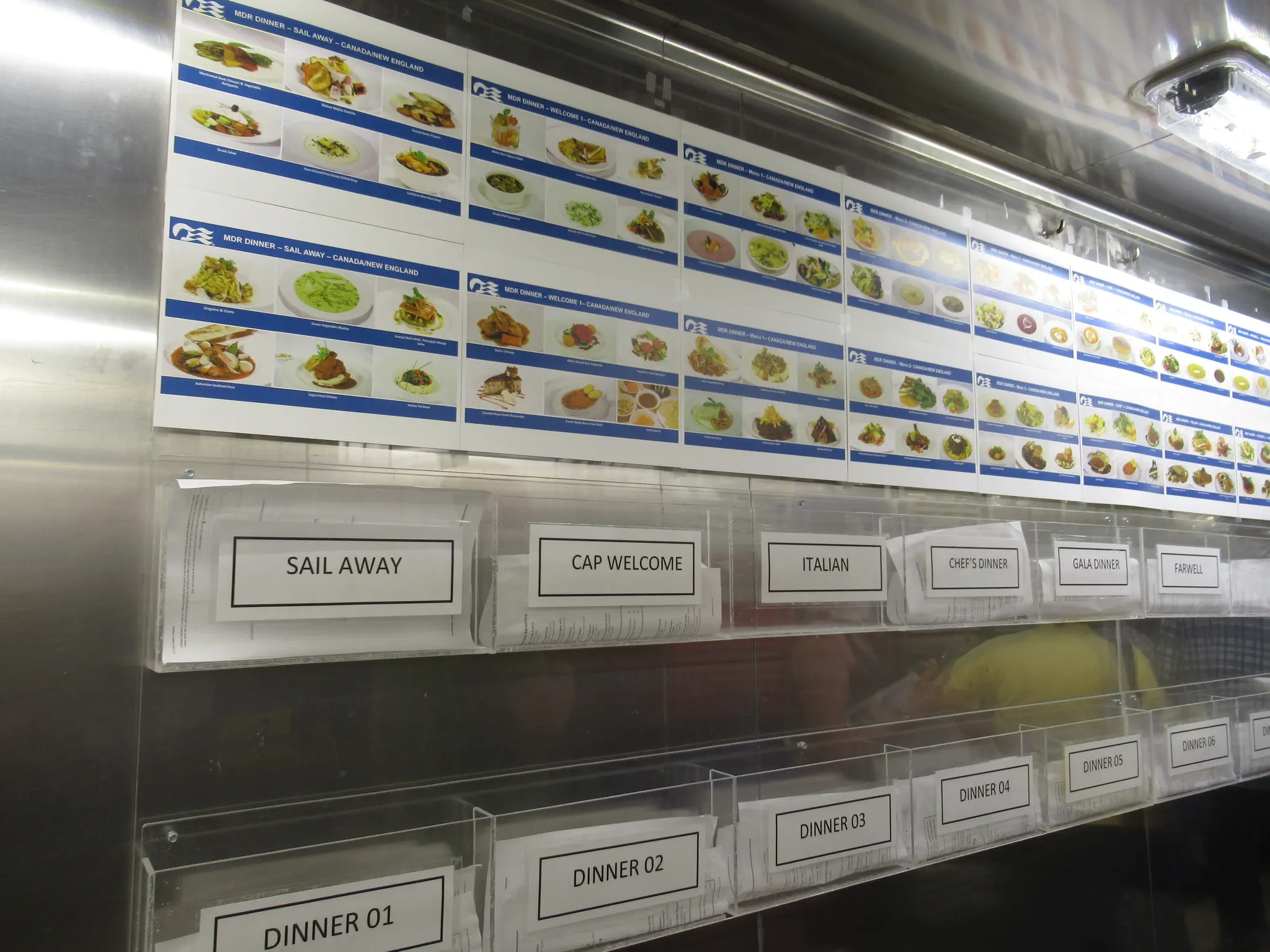 Galley tour -- trays that they bring out all the covered plates, stacked high on, what the food is supposed to look like and what is being served each day, and wow, they had an escalator in the crew area.