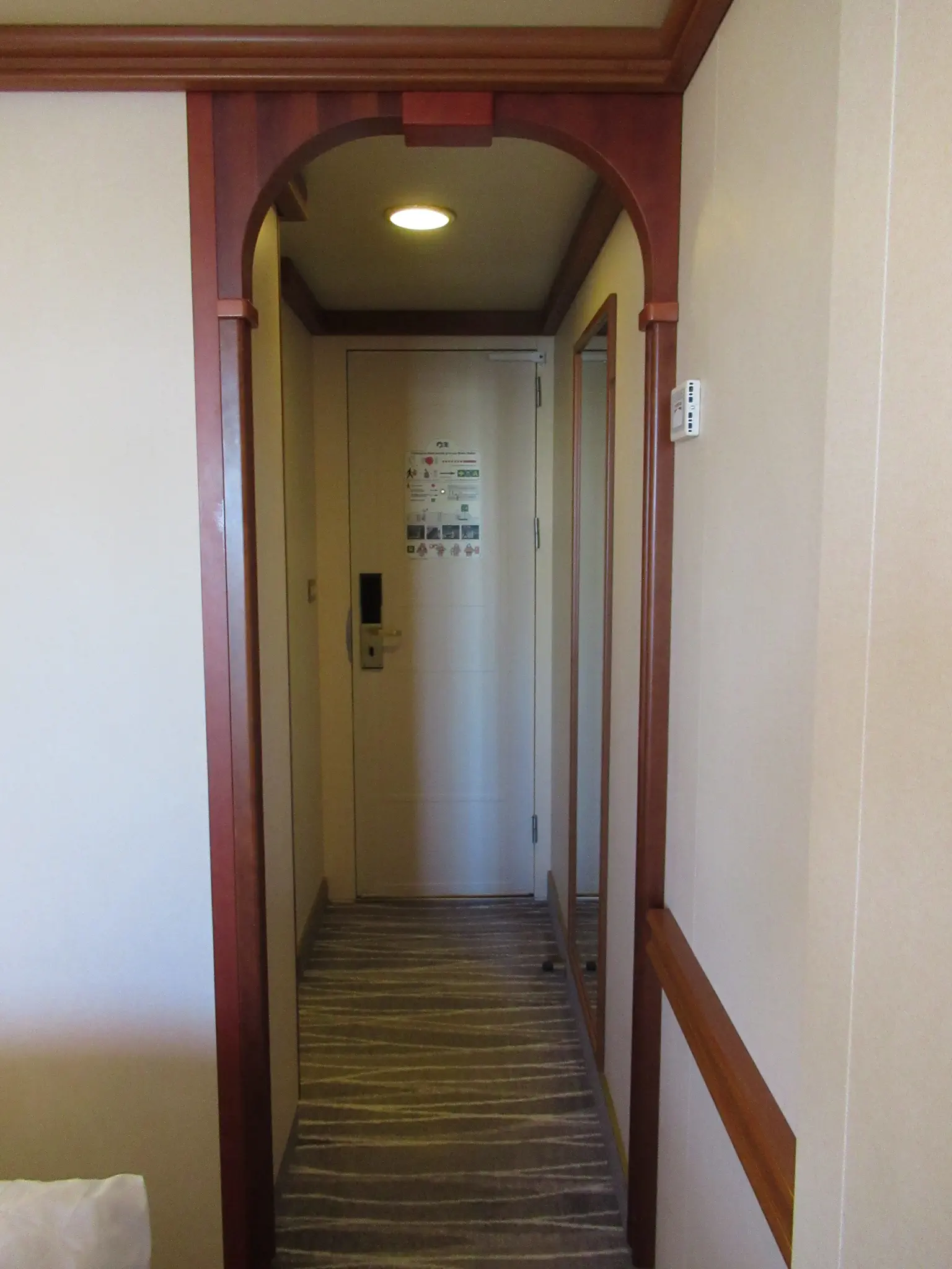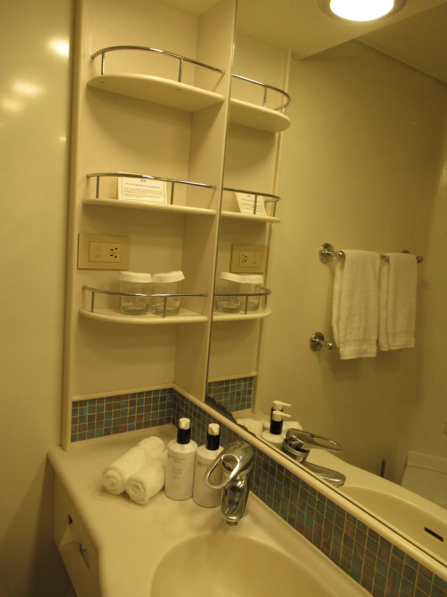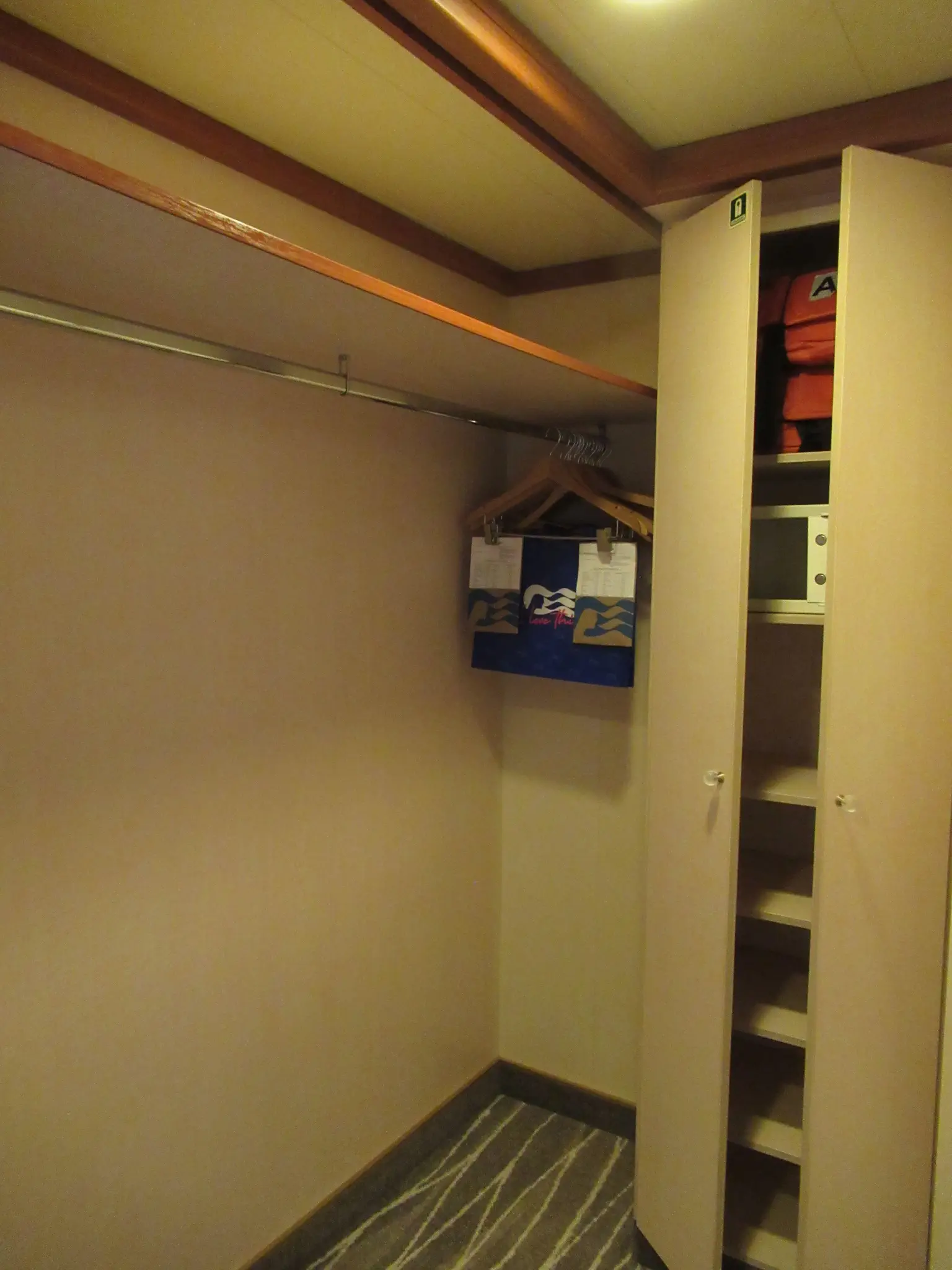 The cabin was roomy with good storage -- each night stand had two drawers and a shelf plus one more set like this. There was also a desk and desk chair. Though the only places to sit was in the desk chair or on the bed. I liked the walk-in closet design on both this ship and P&O UK. It is a lot of closet space that is easy to get to with a closed shelf area with safe. The closet wall helps block light from the bathroom at night since the bathroom is opposite it. Though all ships should really put the light switch on the inside of the bathroom, but I have not seen any that have.